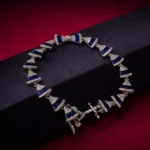 •Accents: Each blue stone is bordered by a pavé-set line of small, round brilliant white crystals or diamonds for added sparkle.