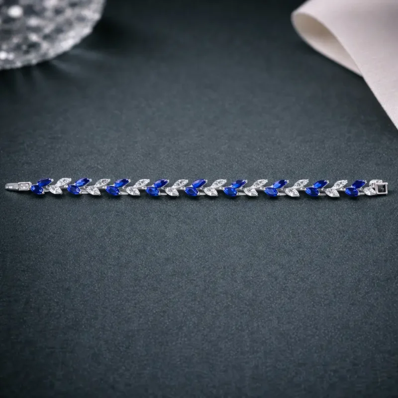 Enhance your jewelry collection with the elegant Sapphire Leaf Girls Silver Bracelet, crafted from premium 925 sterling silver. This bracelet features a delicate leaf-inspired design adorned with shimmering white stones and rich sapphire-blue marquise crystals that create a beautiful contrast.