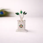 This decorative idol blends traditional artistry with subtle color accents. Crafted in a silver finish, the piece features a beautifully detailed square kalash-style base engraved with ornamental patterns. At the center of the base, multicolored stone accents add a vibrant focal point, enhancing its festive appeal.