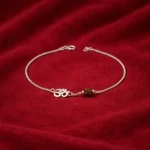 A minimalist spiritual bracelet crafted with a fine silver chain, accented by a polished OM symbol charm and a natural rudraksha bead centerpiece. The balanced placement of the OM motif and bead creates a subtle yet meaningful devotional accessory.