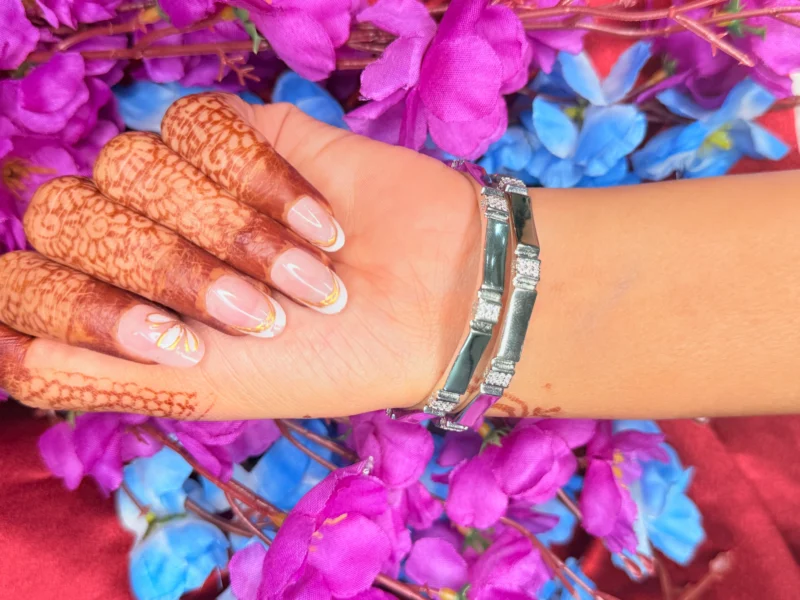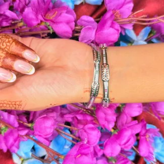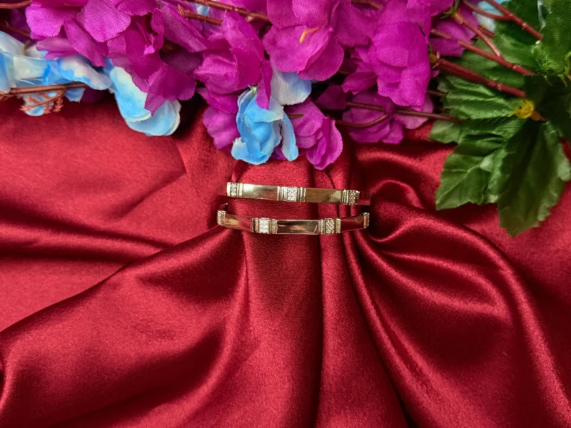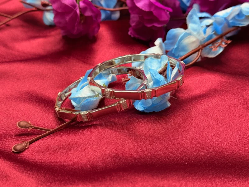 These sleek silver bangles are built for clean, modern styling. Featuring a structured bar design with minimal crystal accents, they give a sharp and polished look without unnecessary heaviness. The glossy silver finish adds sophistication, making them perfect for office wear, casual outings, or pairing with western outfits. If you’re going for a minimal yet premium vibe, this set does the job without trying too hard.