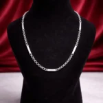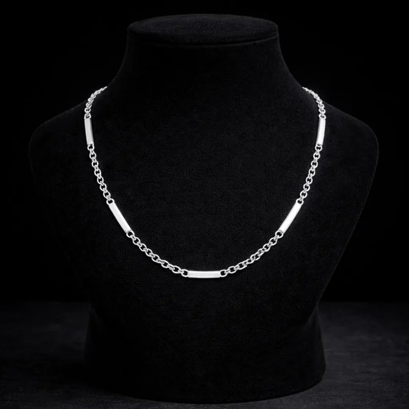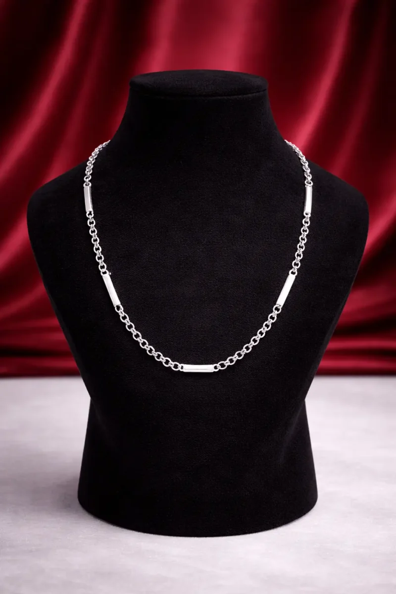 A sleek and modern silver chain designed with minimal bar accents placed at regular intervals. Its lightweight construction makes it comfortable for long wear, while the clean geometry adds a contemporary edge. Ideal for those who appreciate understated yet distinctive jewellery.