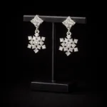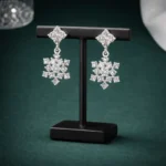 These snowflake diamond drop earrings are designed to command attention. The upper stud features a square cluster formation that transitions into a symmetrical snowflake-inspired drop, fully embellished with precision-set stones. The structure delivers high brilliance without looking bulky.