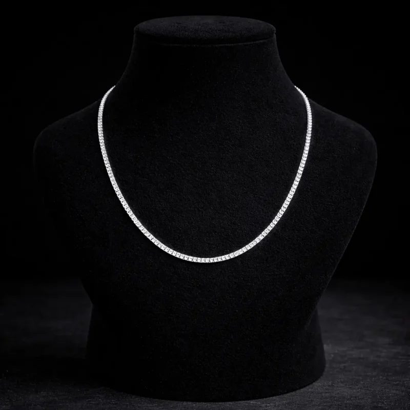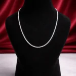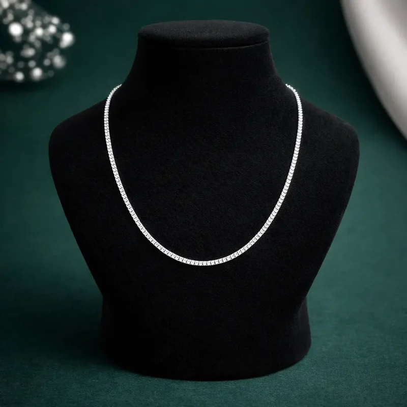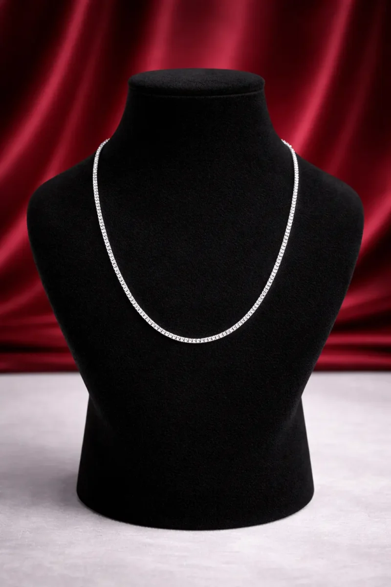 Designed with precision box links, this silver chain offers a refined and structured appearance. The flat profile reflects light beautifully, giving it a polished and contemporary look. Strong yet stylish, it works well worn alone or paired with pendants, making it a reliable everyday chain.