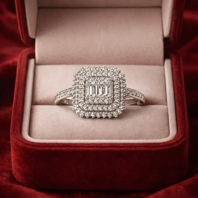 Featuring a square emerald-cut style center stone surrounded by a halo, this ring is crafted in 925 sterling silver. The clean geometry gives it a refined and elegant appearance. Suitable for special occasions.