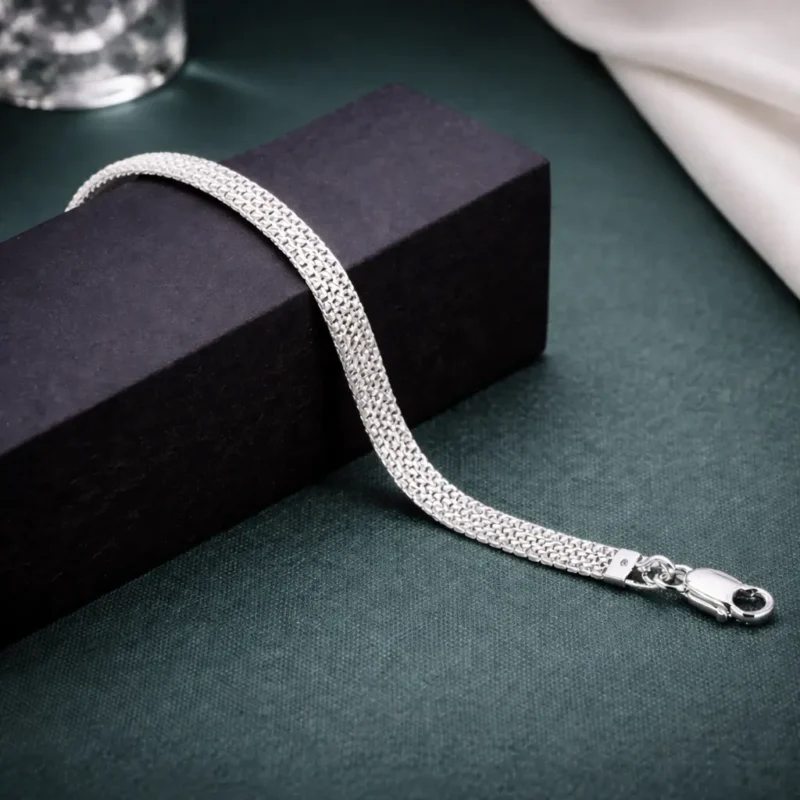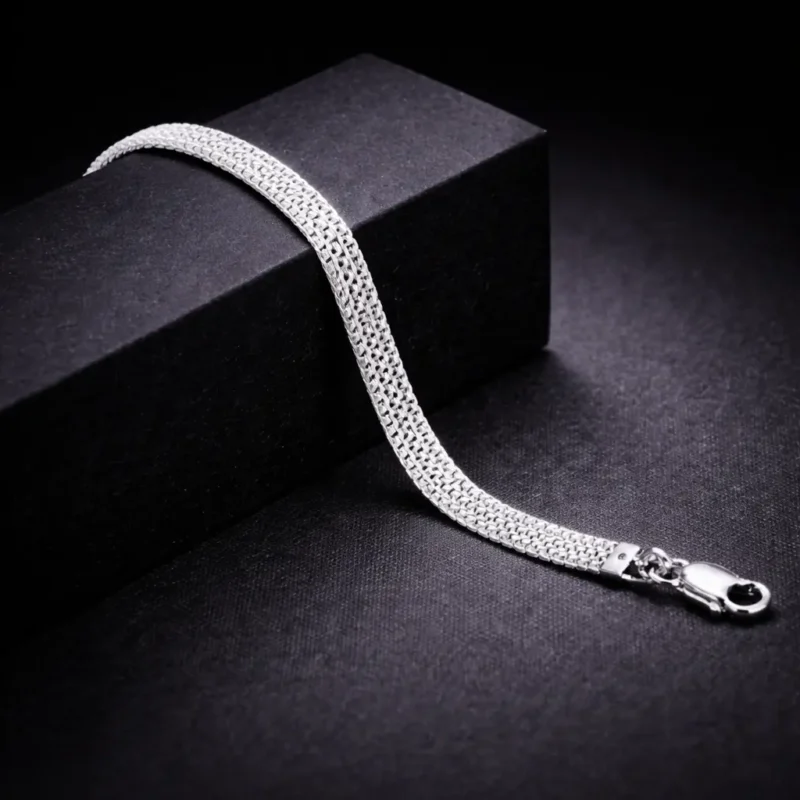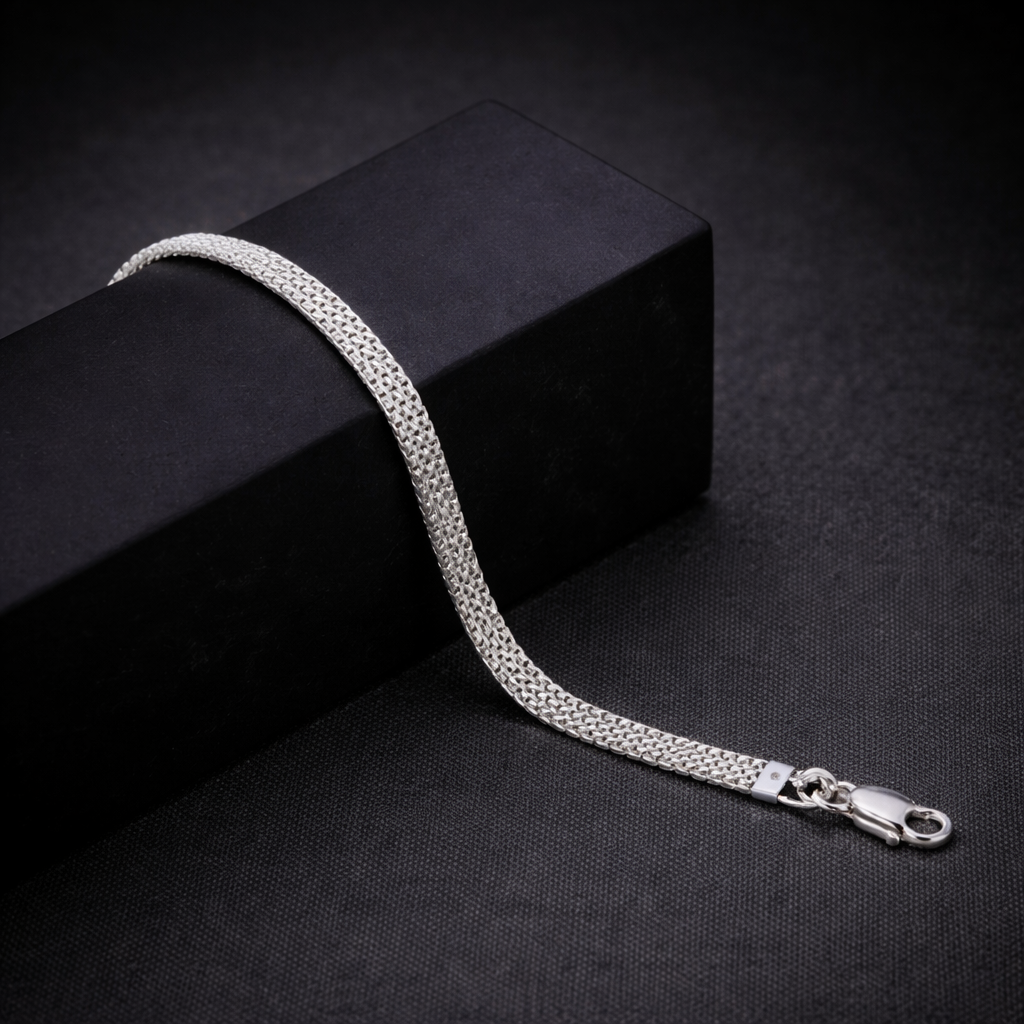 Steel Mesh features a wide, tightly linked structure that delivers a bold yet refined appearance. The silver-tone finish enhances its modern, industrial character, making it ideal for statement styling.