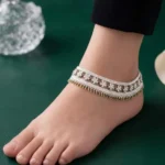 The Sunflower Heritage Payal blends traditional silver structure with warm golden bead accents. Repeating floral elements create rhythm across the ankle while the bottom bead fringe adds motion.