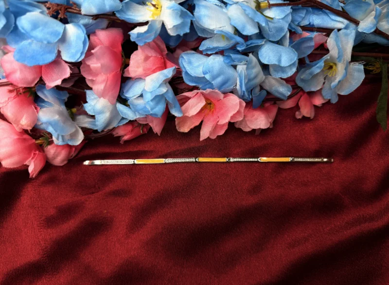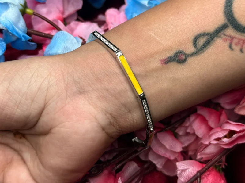 This Sunshine Yellow Minimal Bar Bracelet is built to add a subtle pop of color without going overboard. The bright yellow enamel gives it a fresh, lively vibe, while the crystal-studded sides keep the look polished and premium. It’s simple, clean, and easy to style — exactly what everyday jewellery should be. Whether paired with casual outfits or used as a layering piece, it adds just enough personality without feeling loud. If someone wants minimal jewellery with a bit of color, this is a solid pick.