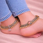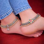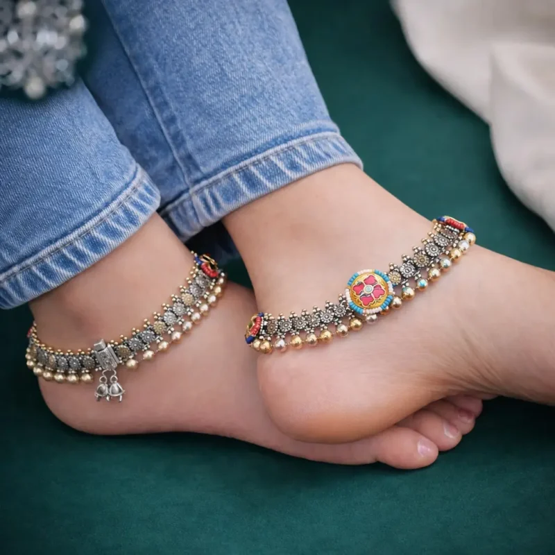 The Surya Medallion Payal combines oxidized silver textures with a bold, colorful enamel round motif at the center. The intricate engraved detailing across the band gives it depth, while the gold bead lining along the bottom adds contrast and richness. This design has a strong ethnic identity and is built for festive wear, traditional outfits, and statement styling. It’s not minimal — it’s expressive and unapologetically traditional.