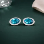 features vibrant oval-cut teal stones encircled by a delicate halo of brilliant accents. The contrast between the rich gemstone color and the bright frame creates a luxurious aesthetic. Ideal for elevating evening wear or adding color to minimal outfits.