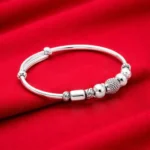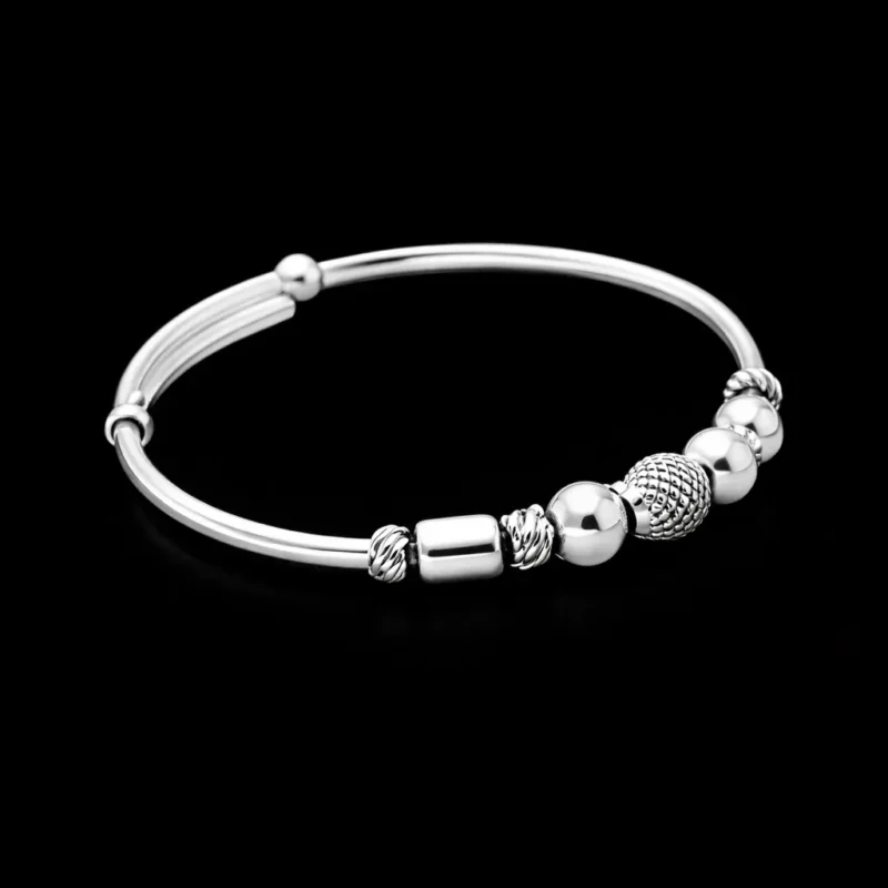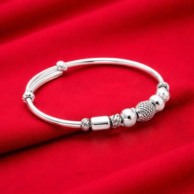 A refined silver kada pair featuring a polished round band enhanced with alternating smooth beads, textured spherical beads, and sleek cylindrical elements. The mix of finishes creates a more premium and slightly mature look compared to basic bead designs.