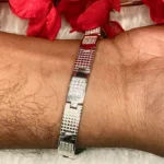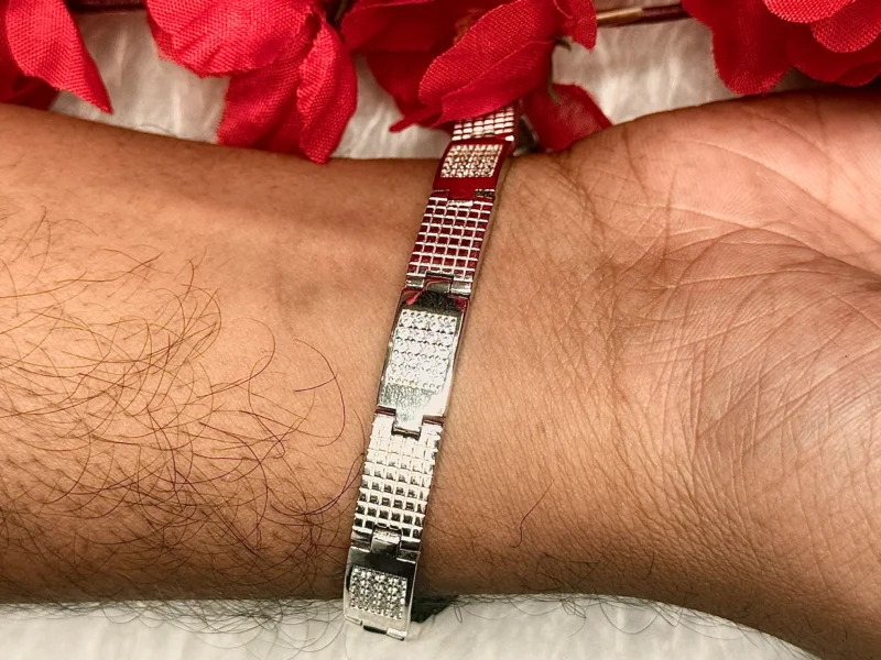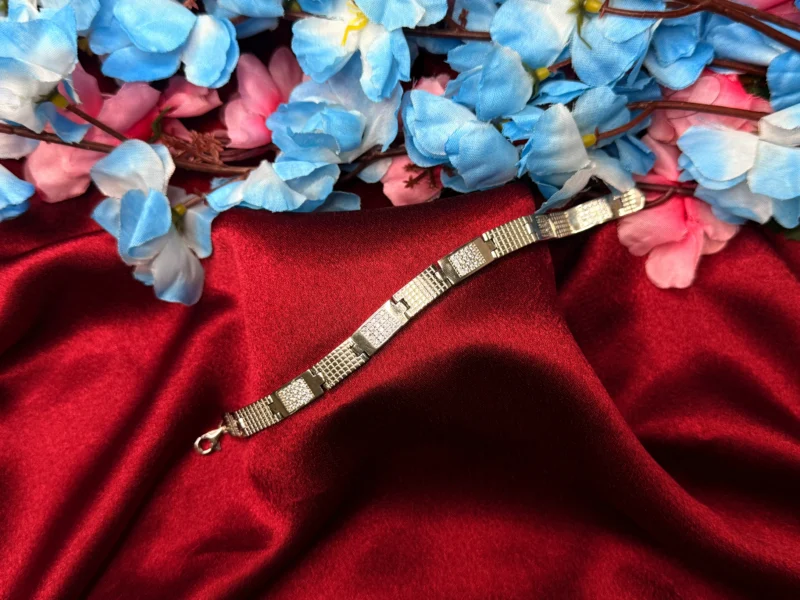 This textured grid pattern silver bracelet is designed for men who prefer a bold and noticeable style. The wide links combined with a detailed grid texture create a strong visual presence, making it stand out from standard minimal designs. Its solid construction ensures durability, while the structured design adds a premium edge. Perfect for those who want a statement accessory that enhances their overall look with confidence and strength.