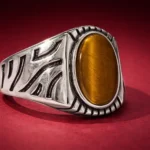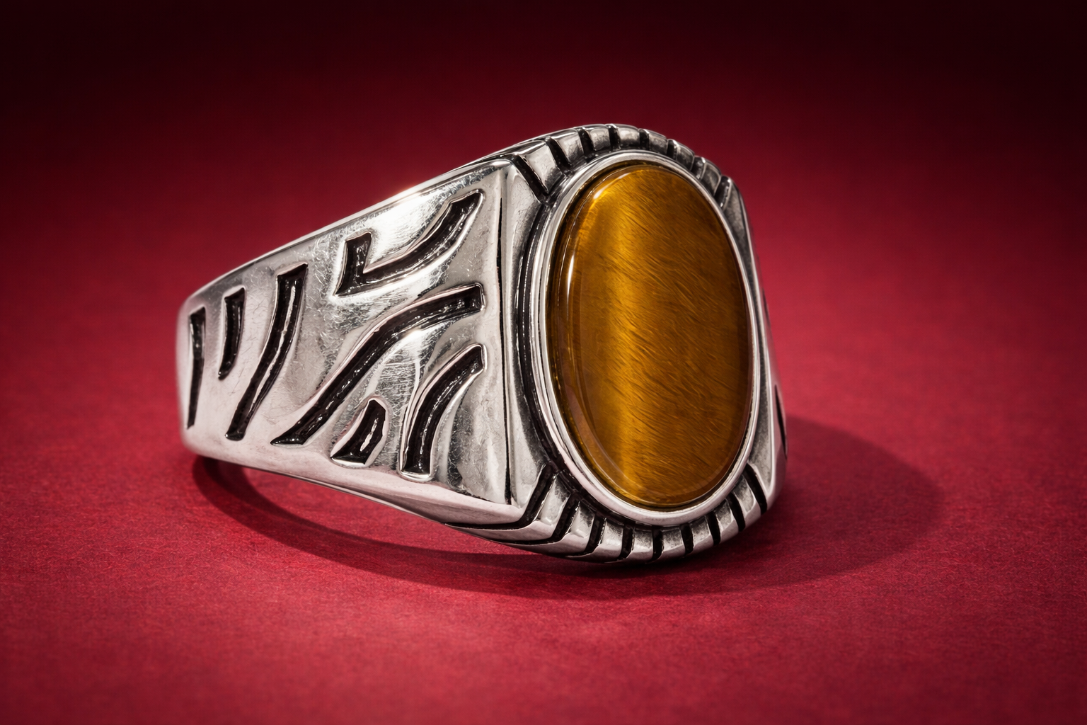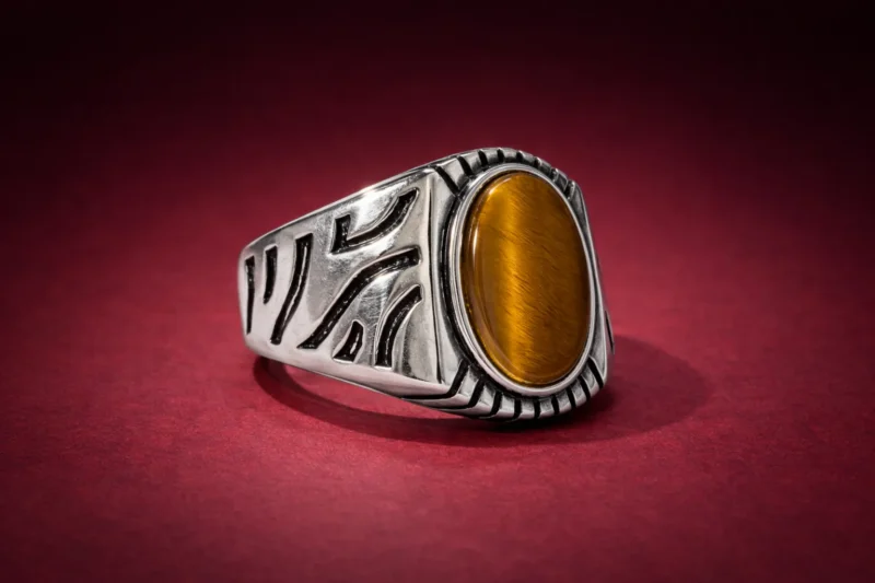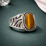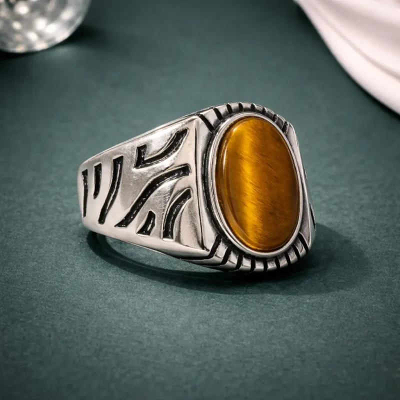 The band is engraved with sharp, flowing tribal-style patterns that add texture and masculinity. The tiger eye gemstone is often associated with confidence and protection, making this ring ideal for those who prefer earthy tones and bold traditional styling. It works well for everyday wear and semi-formal looks.