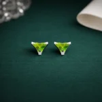 Make a modern style statement with these striking triangle-cut lime green gemstone stud earrings. Designed with a contemporary geometric shape, these earrings combine bold design with vibrant color to create a unique and eye-catching accessory.