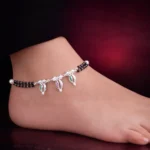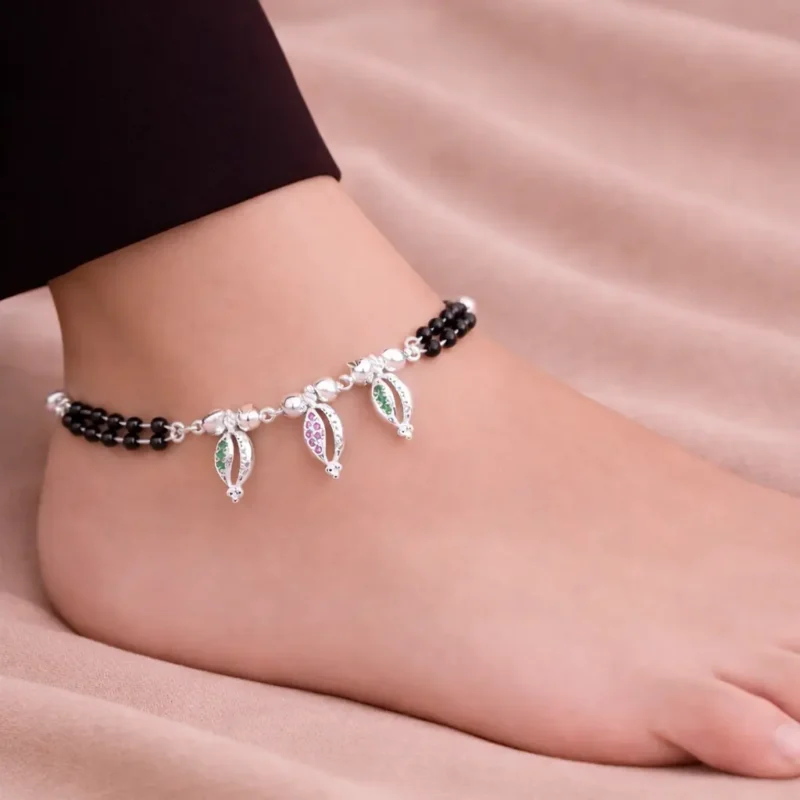 The Triveni Black Bead Charm Payal combines traditional black bead styling with delicate multicolor enamel leaf charms at the center. The double-strand black bead design gives it a subtle ethnic identity, while the central charms add a refined decorative touch.