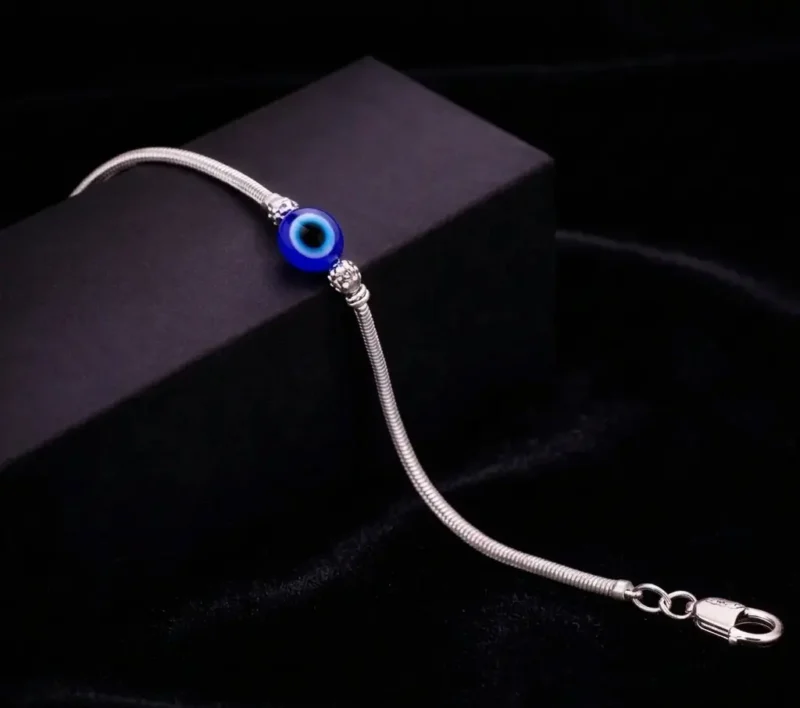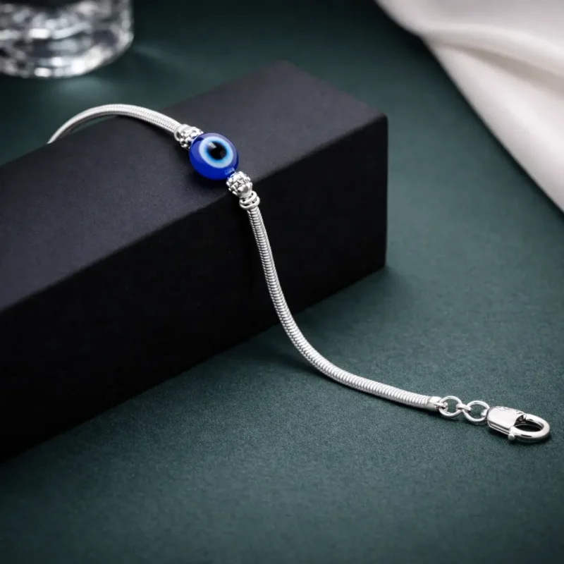 Vigil Snake combines a smooth snake chain with a central evil eye bead for a modern protective accessory. Lightweight and flexible, this bracelet is ideal for daily wear while adding a subtle statement.