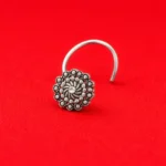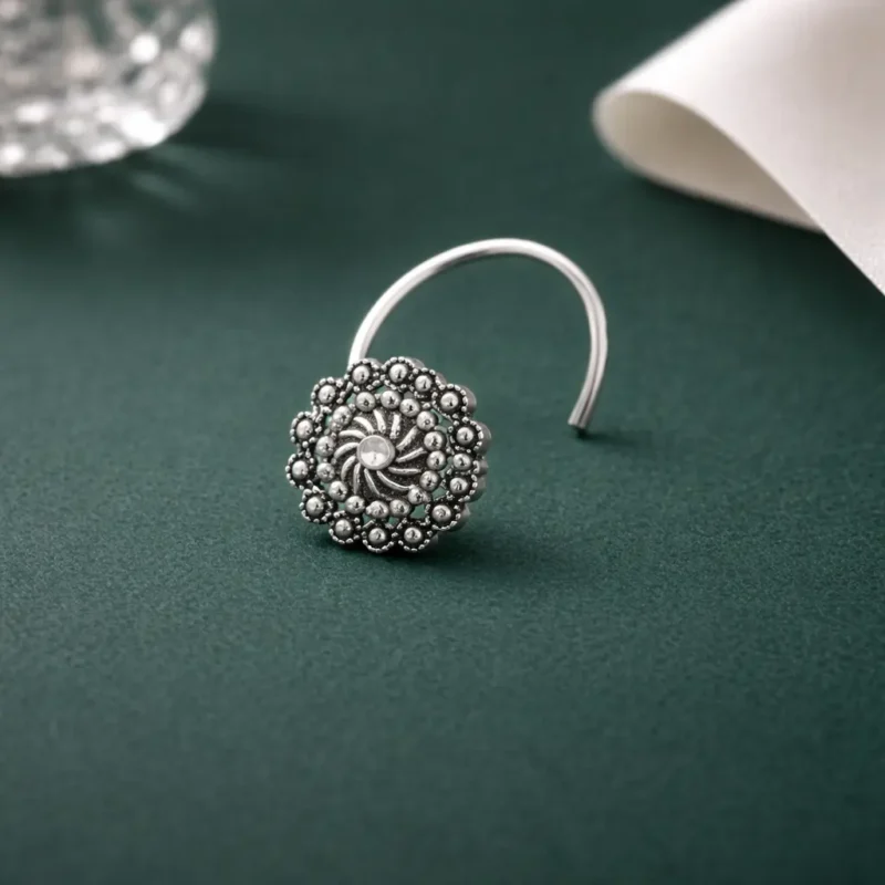 Beautiful oxidized silver nose pin with an intricate floral design. Traditional, elegant, and perfect for ethnic wear.