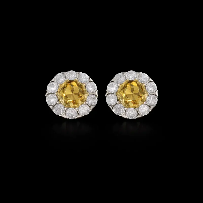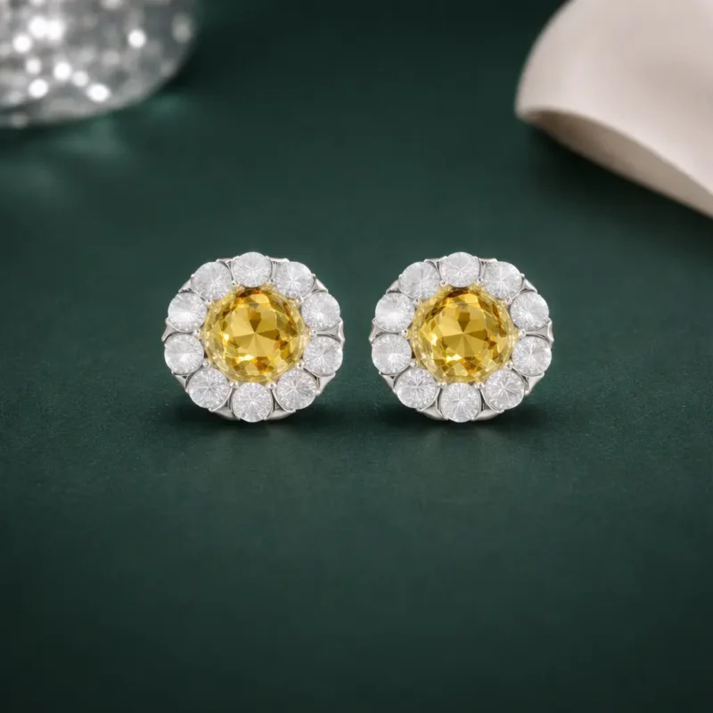 highlights a warm yellow center stone surrounded by a floral arrangement of sparkling accents. The design resembles a blooming flower, offering a soft yet glamorous appeal. A perfect choice for customers who prefer classic shapes with a vibrant twist.
