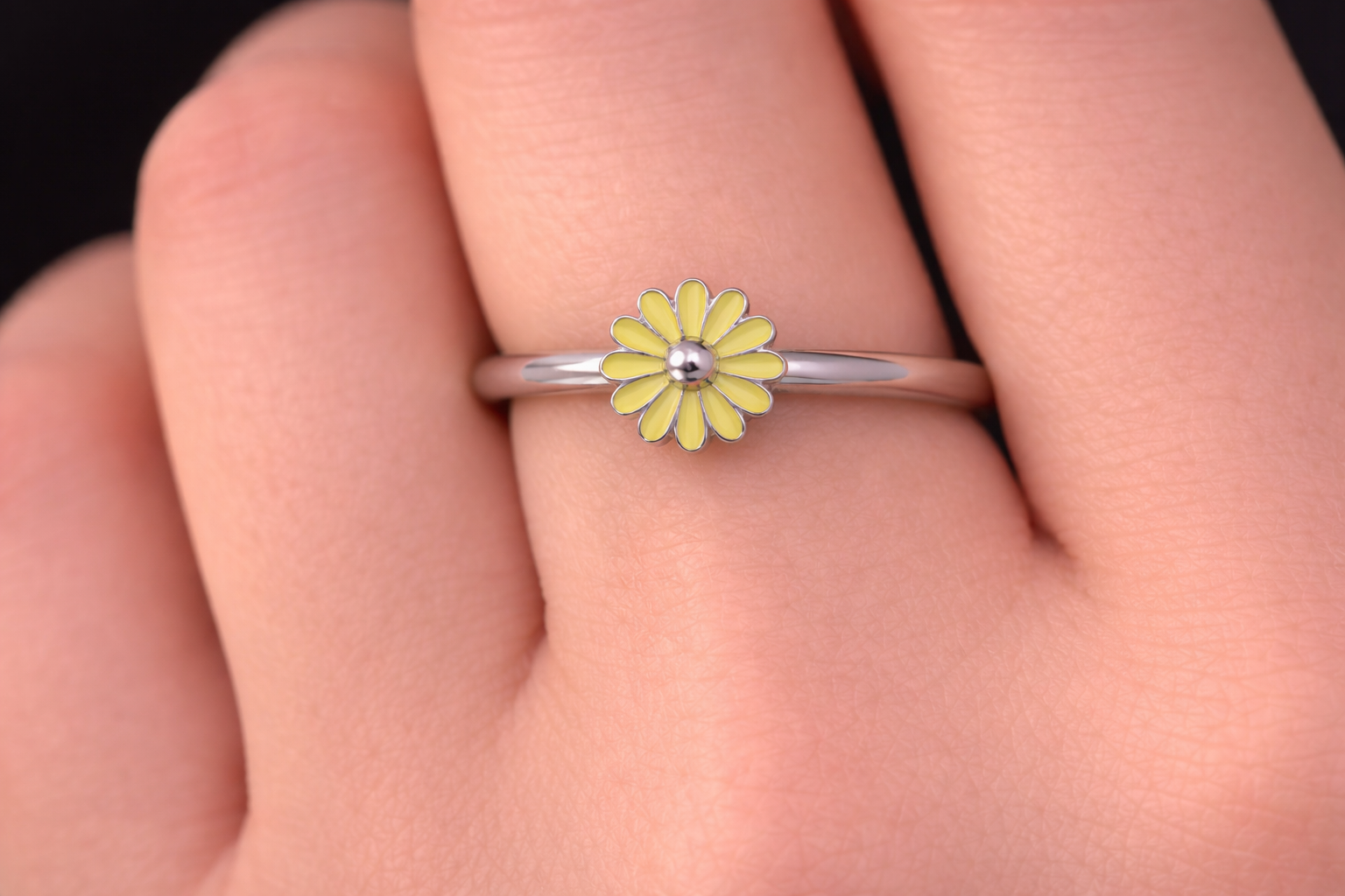 This ring features a daisy motif enhanced with yellow enamel work. Crafted from 925 sterling silver, it offers a playful and fresh design. Lightweight and comfortable, it’s ideal for daily wear.