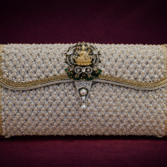 Fully pearl-embellished clutch with gold crest detailing and royal clasp accent.