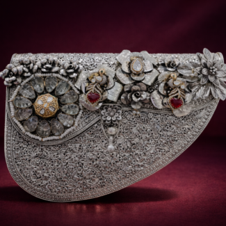 Pearl-embedded clutch with sky-blue beaded center panel and gold crescent embellishments.